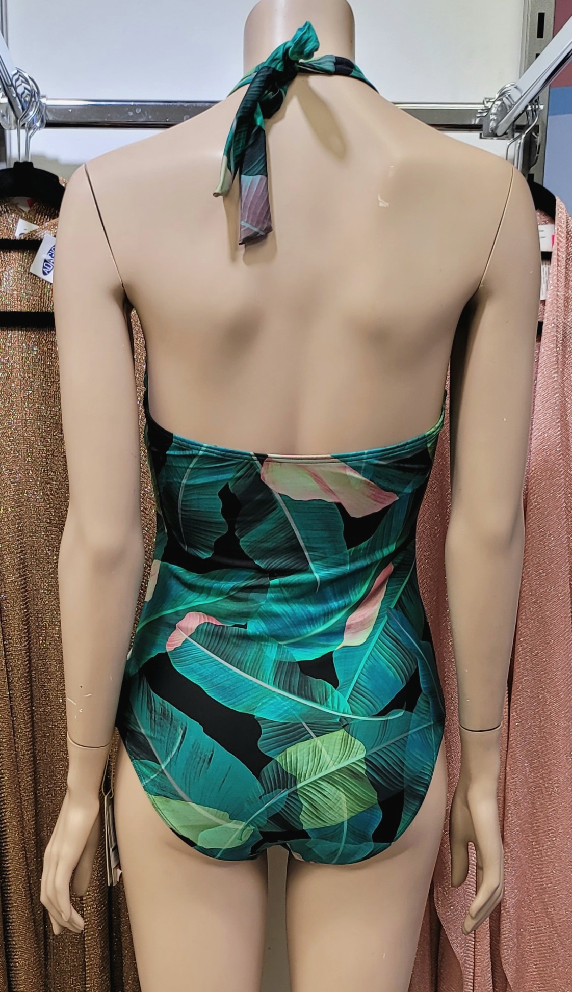 Jednodelni kupaci kostim bez zice, tanko postavljen na grudima, bretele se vezuju oko vrata i ne skidaju se. Ledja su ravno secena pozadi