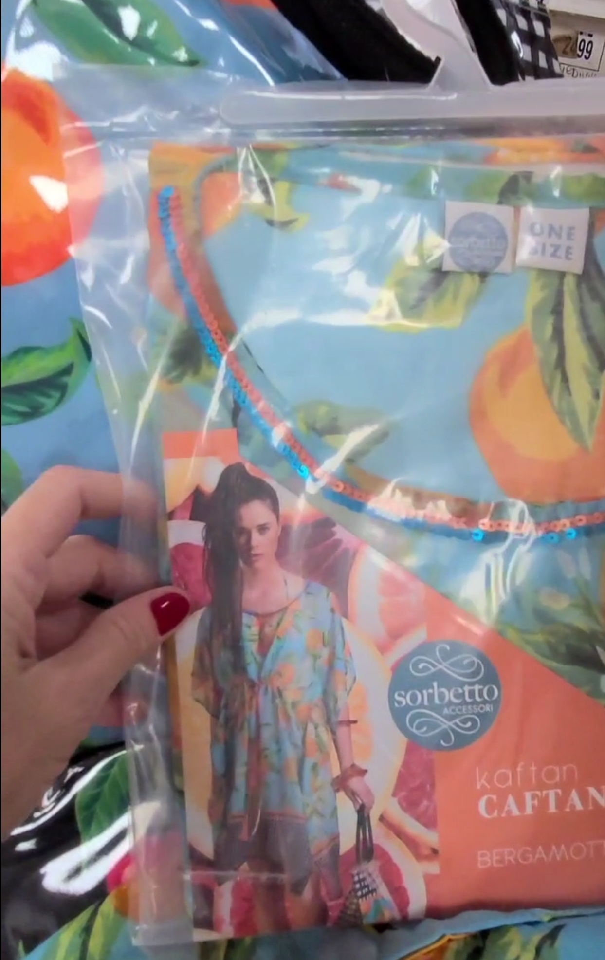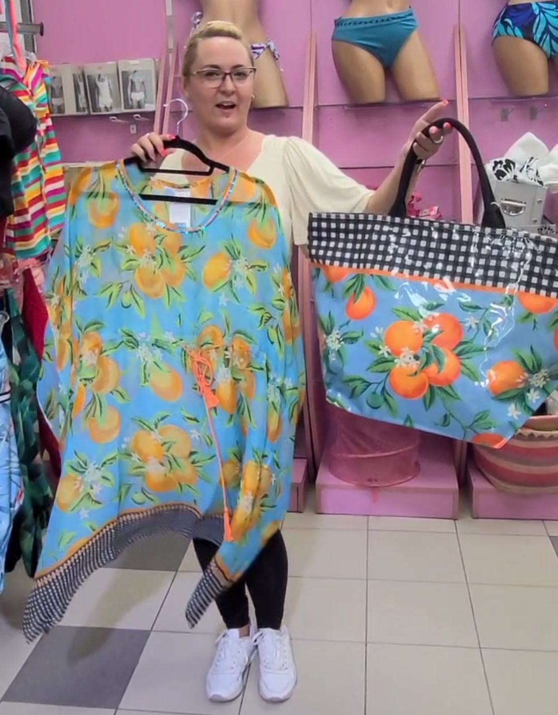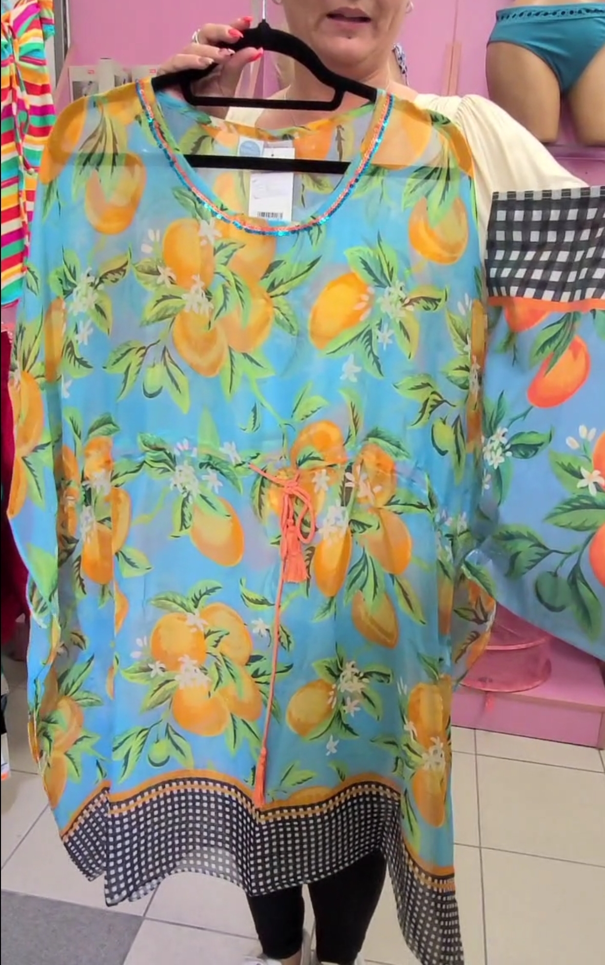 Kaftan u dezenu pomorandze je prozracan i sa uckurom u pojasu. Obim grudi je oko 120cm, duzina oko 90cm