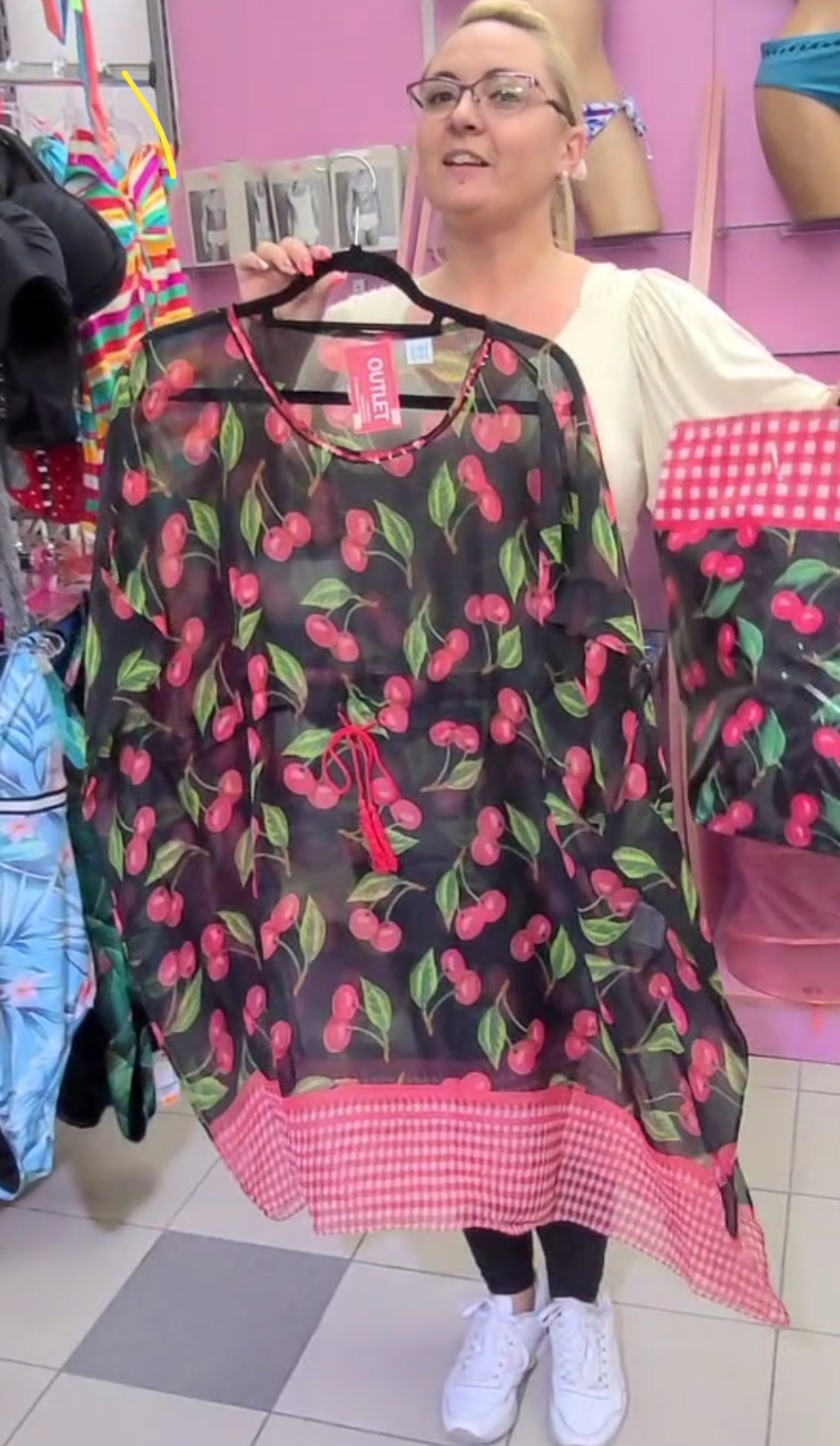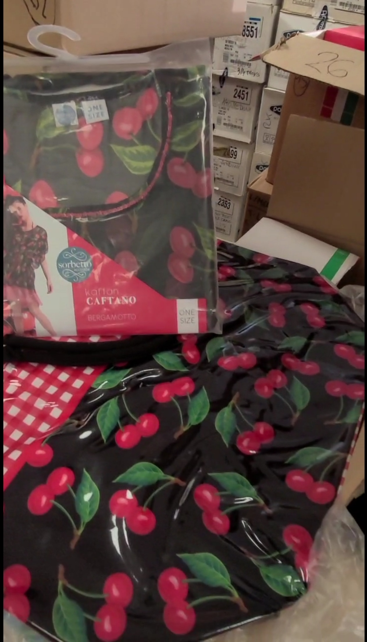 Kaftan u dezenu tresnjice je prozracan i sa uckurom u pojasu. Obim grudi je oko 120cm, duzina oko 90cm