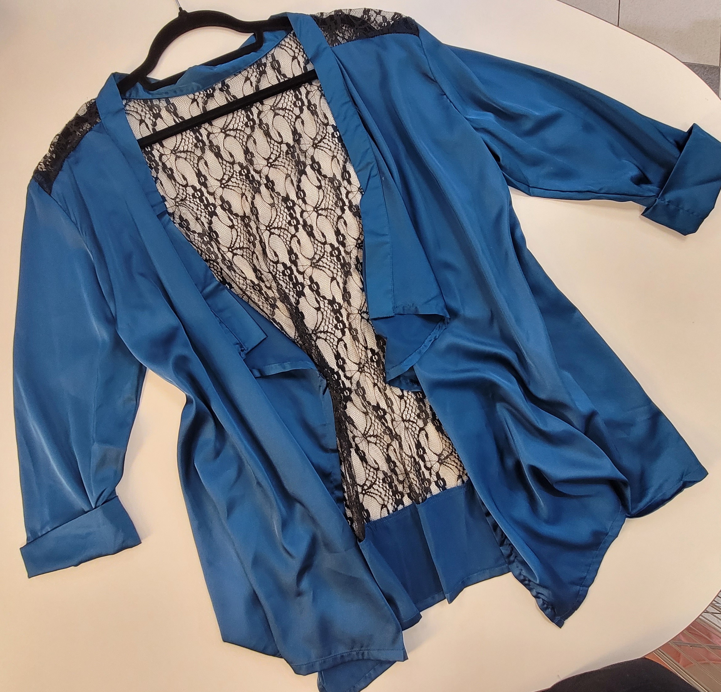 Zenski ogrtac, kraci bade mantil u petrolej plavoj boji sa crnom cipkom na ledjima, model 043170
